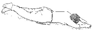 Arm ist etwas stärker gestreckt als der rechte, die linke Hand liegt seitlich